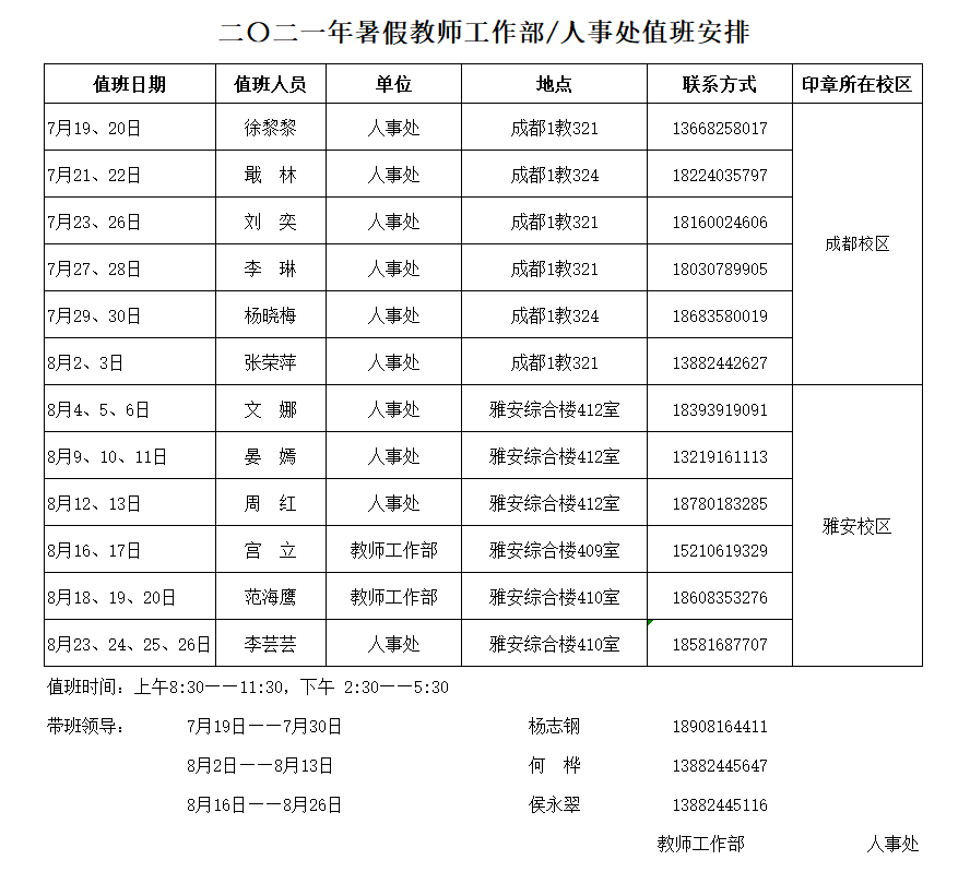 教师工作部、人事处二〇二一年暑假值班安排