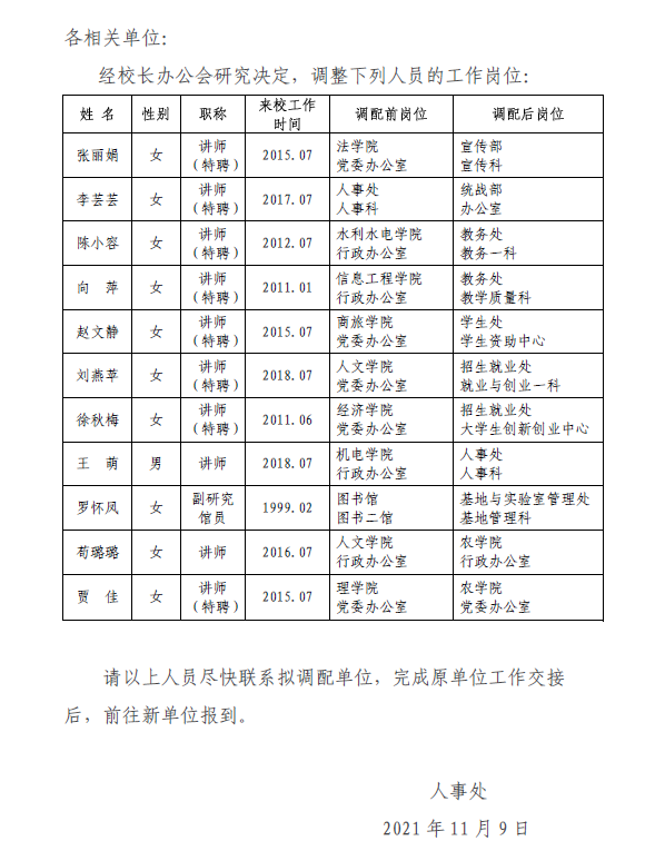 关于张丽娟等岗位调配的通知