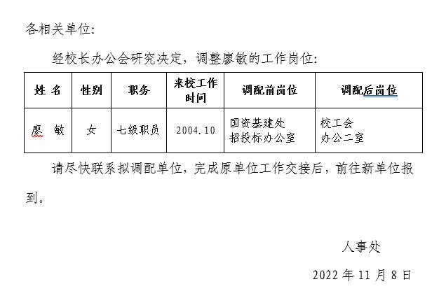 关于廖敏岗位调配的通知