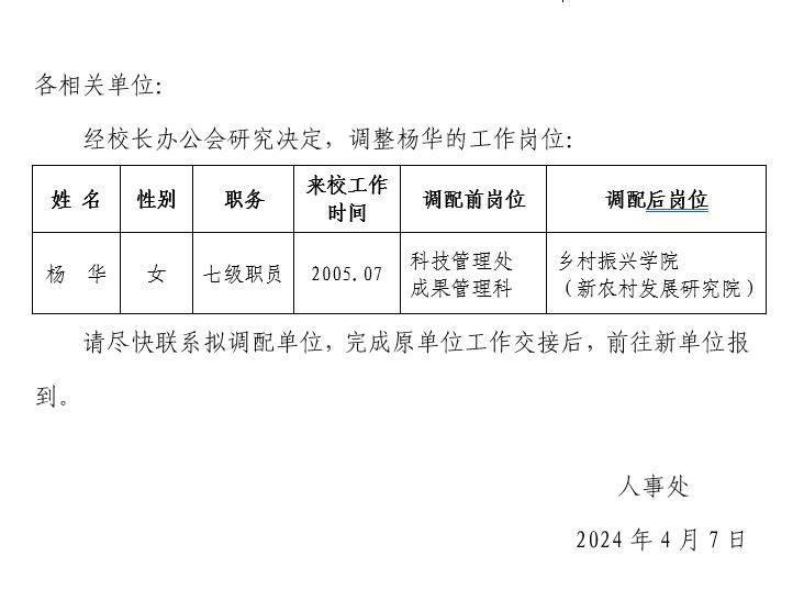 关于杨华岗位调配的通知