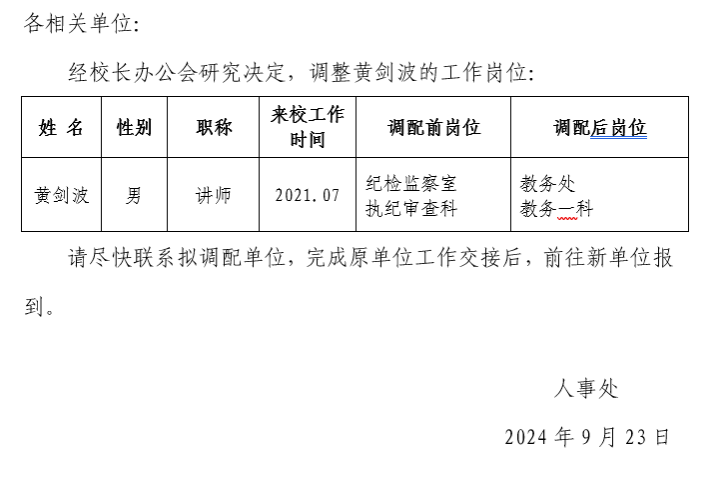 关于黄剑波岗位调配的通知