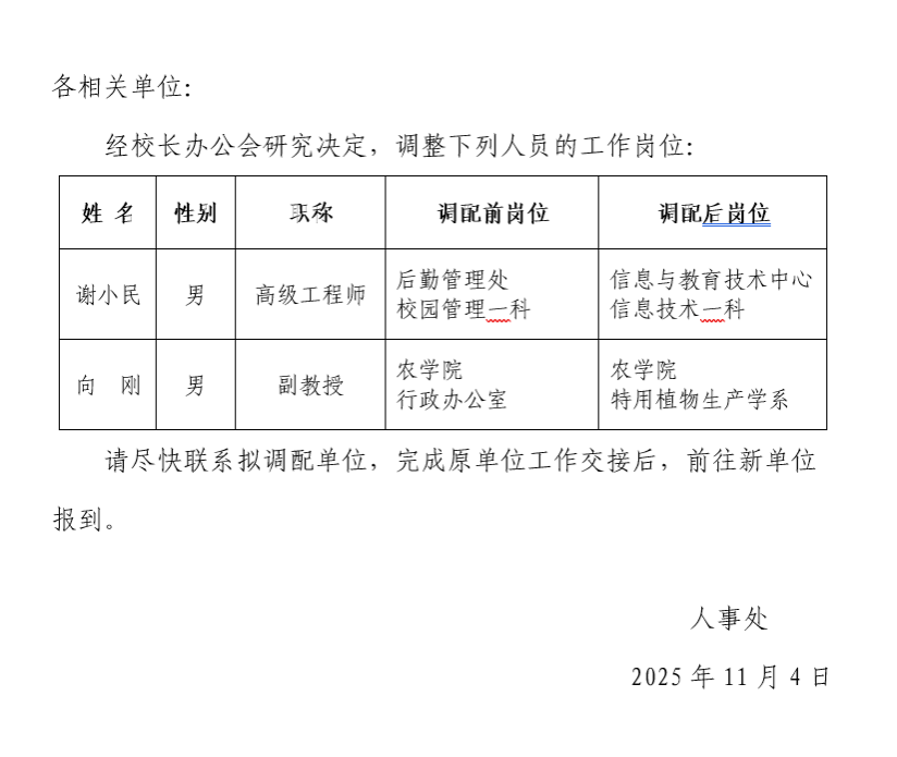 关于谢小民等岗位调配的通知
