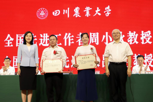 党委书记庄天慧教授、校长吴德教授为全国先进工作者周小秋教授和全国脱贫攻坚先进个人吕秀兰教授颁奖