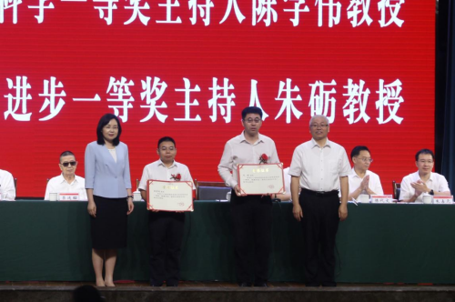 党委书记庄天慧教授、校长吴德教授为四川省自然科学一等奖主持人陈学伟教授和四川省科技进步一等奖主持人朱砺教授颁奖
